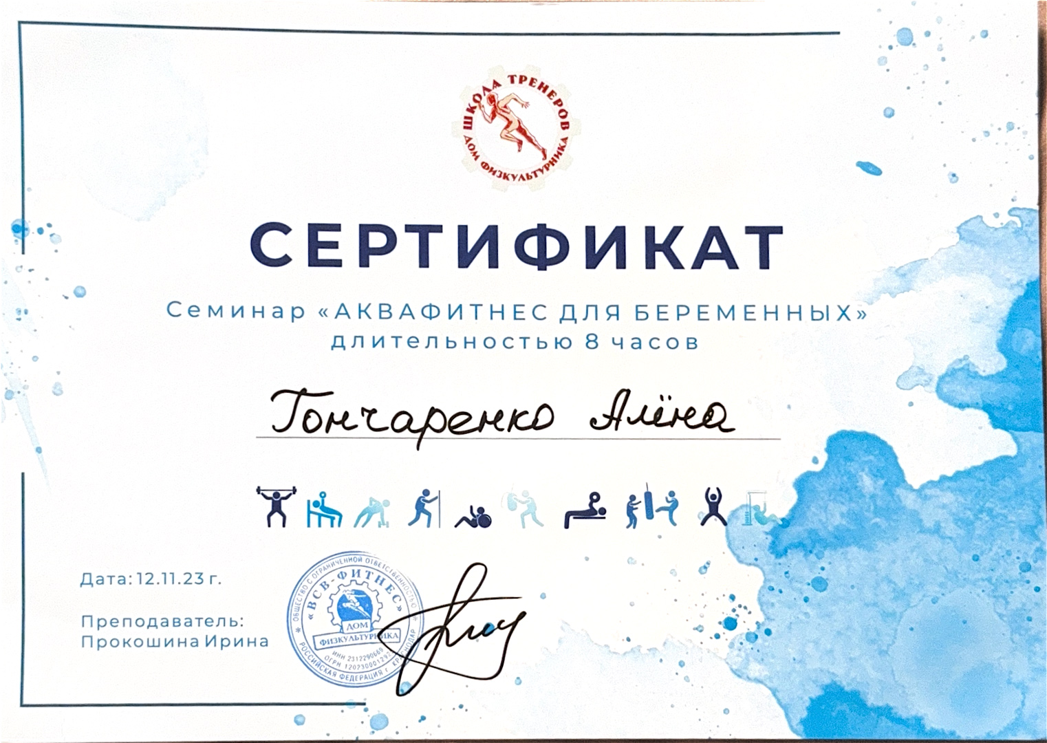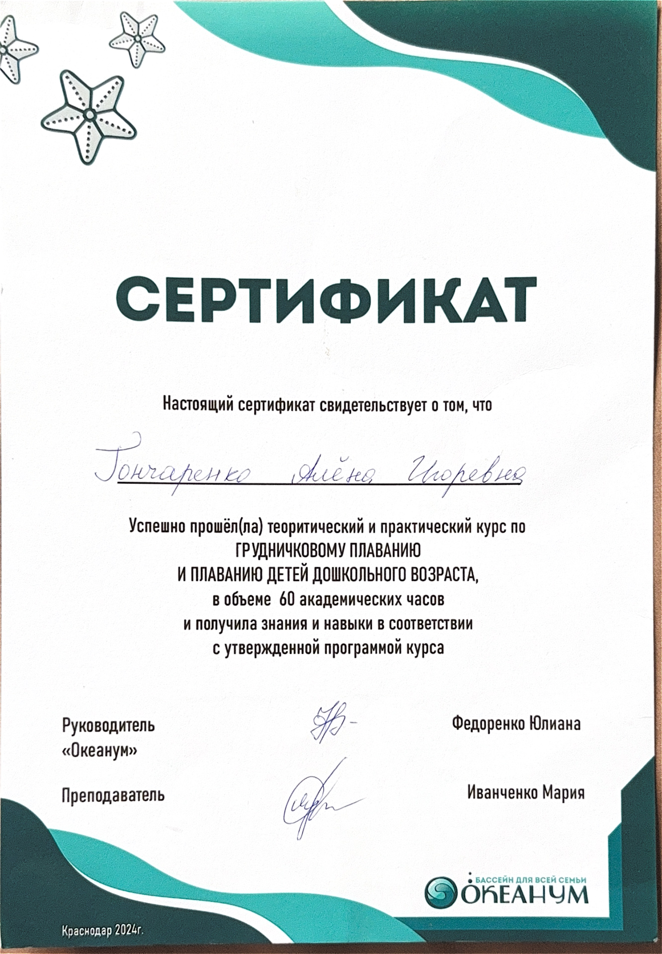Регулярно прохожу дополнительные обучения и повышения квалификации, в данный момент изучаю одну новенькую методику по обучению детскому плаванию.
